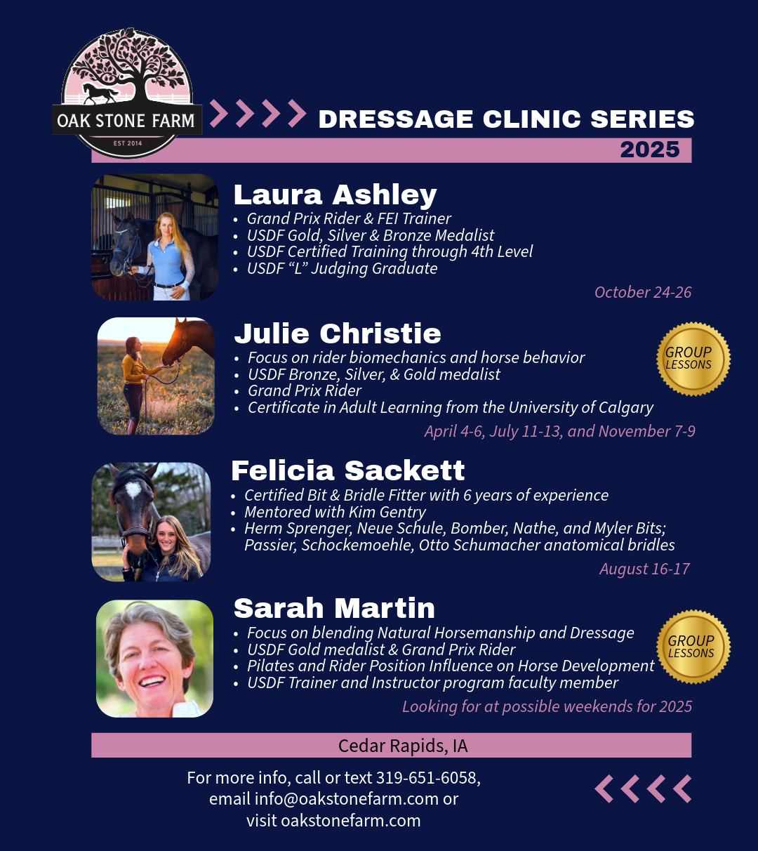 While we may host private dressage clinics periodically throughout the year, we do not offer any boarding or training services at this time. To connect with us, please follow us on social media.